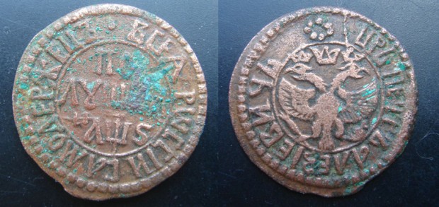 5. Монета, самая маленькая по достоинству и весу, называлась полуденьга. Ее номинальная стоимость составляла четверть копейки, а вес был 0,17 граммов.