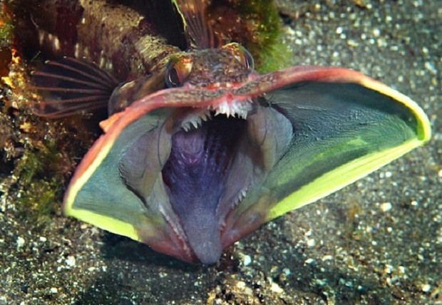 Эта рыбешка может похвастаться огромным зубастым ртом, которым, несомненно, может обладать только хищник. Рыбешка вида Neoclinus blanchardi или, как ее еще называют, щучья морская собачка, выглядит довольно устрашающе. До того, как этот морской обитатель открывает рот, его внешность не особо отличается от внешности обычных рыб, хотя у него имеются странные морщинистые щеки, как у старика.