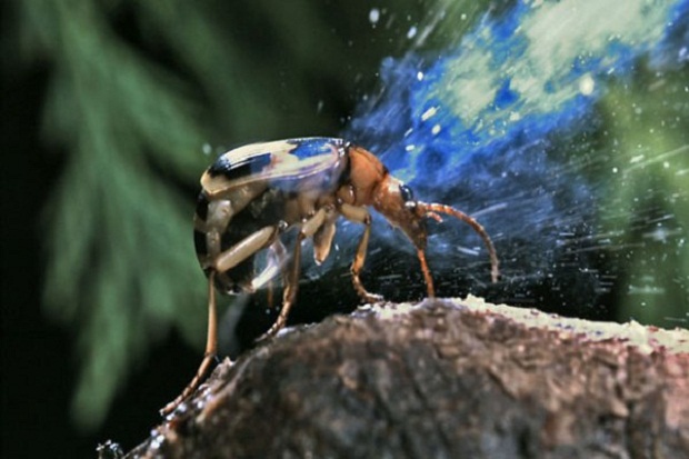 Невероятно сложный по строению жук-бомбардир обладает удивительной и уникальной способностью: при потенциальной угрозе он стреляет с невероятной скоростью кипящей химической жидкостью, которая аккумулируется в его животе.