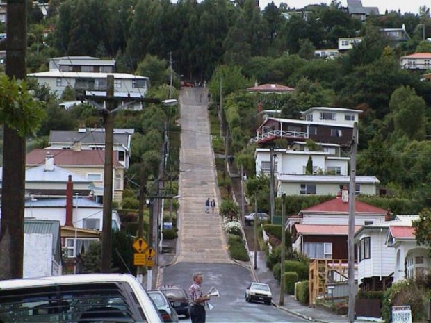 Болдуин стрит в городе Данидин в Новой Зеландии носит звание самой крутой улицы в мире. В этой стране много городов было построено на горной и холмистой местности. Уклон улицы составляет 35 градусов, и она настолько крутая, что верхняя ее часть сделана из бетона, так как в жаркую погоду обычный материал дорог просто соскользнет вниз.