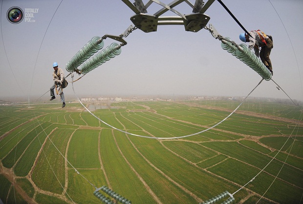 Электрики работают на опоре ЛЭП на фермерских угодьях в округе Чучжоу, провинция Аньхой, Китай.