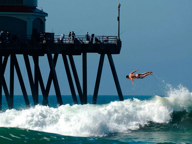 Молодой человек занимается сёрфингом в городе Хантингтон-Бич, штат Калифорния.