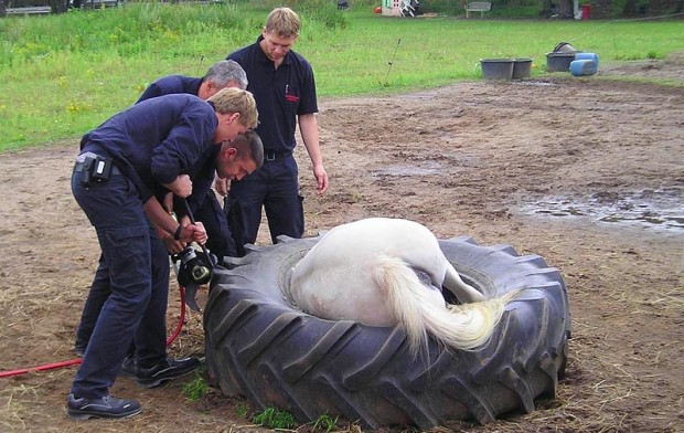 Пожарные спасли лошадь, застрявшую в тракторной шине в Ганновере. Шина использовалась в качестве лохани для еды.