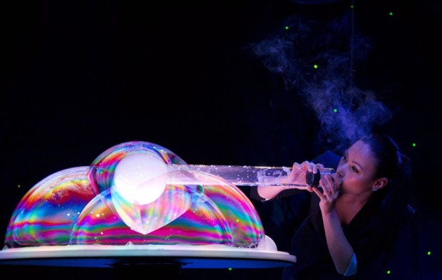 Мастер мыльных пузырей Мелоди Янь смотрит через пузыри во время выступления «на разогреве» в Ванкувере.
