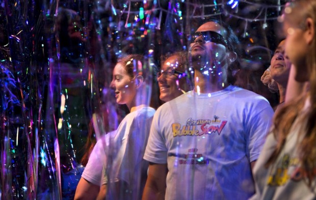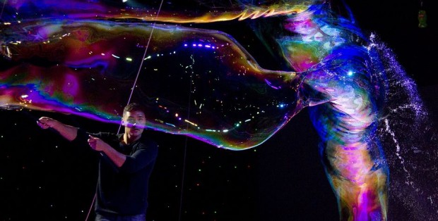 Огромный мыльный пузырь образуется вокруг восторженных зрителей на шоу в Ванкувере.