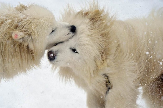 Самоедские лайки играют перед гонкой на собачьих упряжках в Швейцарии.