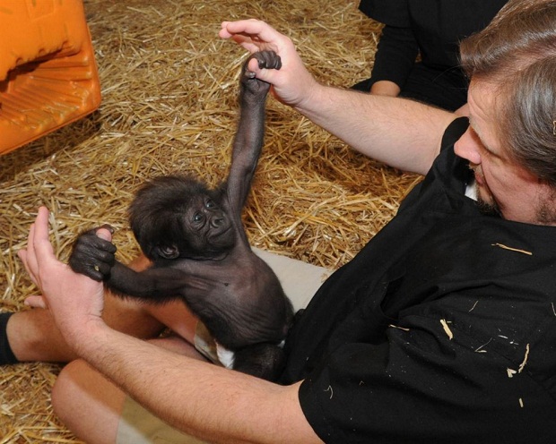 Работник зоопарка играет с детёнышем гориллы по имени Глэдис так, как играла бы с ним мать, в Техасе.