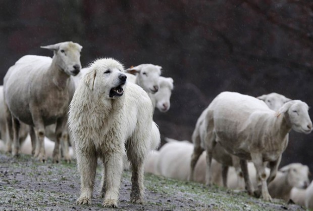 Мареммо-абруццкая овчарка охраняет отару овец от койотов и других хищников на ферме в Генте, Нью-Йорк.