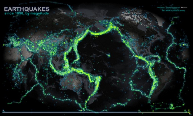 На этой новейшей карте землетрясений представлены все землетрясения, произошедшие с 1898-го года силой от 4-х баллов и выше.