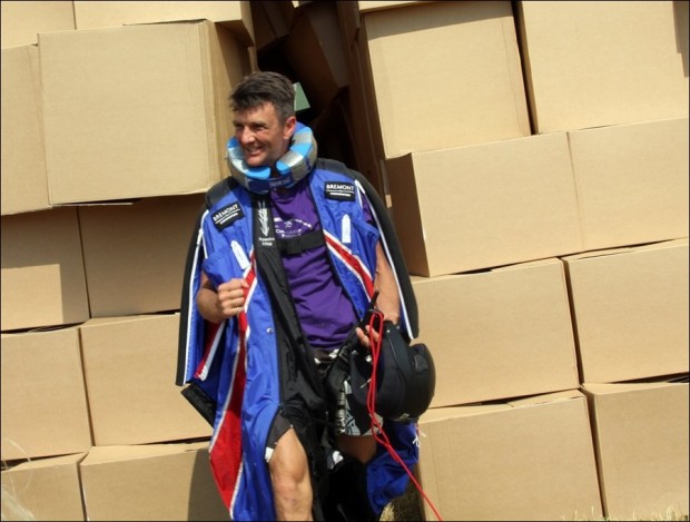 Для прыжка 42-летний каскадер из Оксфордшира изготовил себе специальный костюм, имитирующий крылья. Прежде чем изготовить его, Коннери следил за тем, как крупные птицы используют хвост для корректировки направления полета. Затем каскадер совершенствовал свой костюм, прыгая по горам и скалам в Италии и Швейцарии.