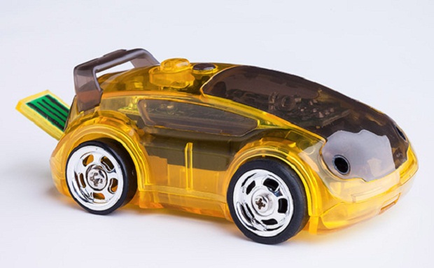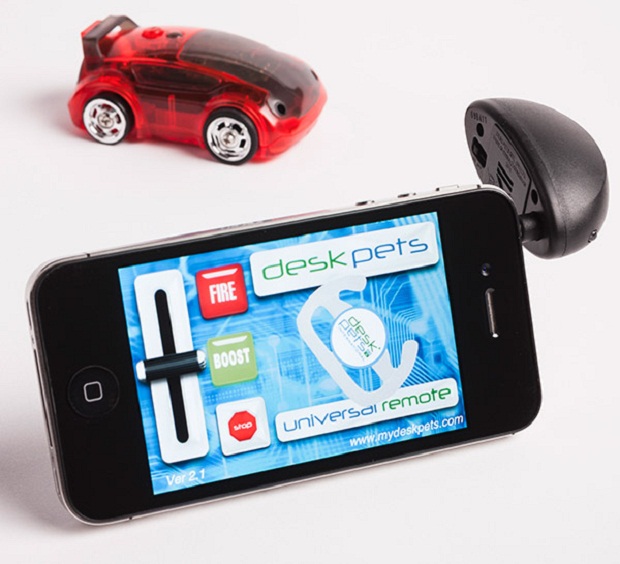 Эта интересная и недорогая ($ 29.99) игрушка от компании DeskPets, управляется с помощью iPhone или Android-смартфона. Для этого понадобится подключить специальный адаптер с ИК-передатчиком к аудиоразъему. Четыре машинки разных цветов могут использоваться одновременно, благодаря индивидуальному коду управления.