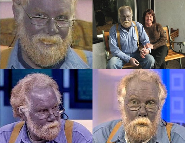 Пятидесяти семи летний Калифорнийский житель отличается от всех людей необычным цветом своего лица. Его кожный покров стал синего цвета по причине многолетнего потребления коллоидного серебра для излечения дерматита. (Paul Karason) Пол Карасон четырнадцать лет тому назад заболел дерматитом.