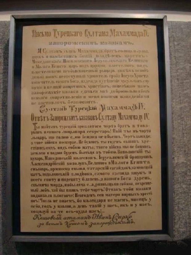 Все мы в школе, на уроке истории, изучали исторический факт о том как Запорожские казаки писали письмо турецкому султану. Так что же было написано в этом письме? Предлагаю Вашему вниманию оригинал этого знаменитого письма.