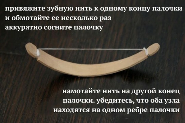 Инструкция о том, как вы можете смастерить своими руками прикольный мини-лук и по полной оторваться, расстреляв из него сотрудников на работе ;) Для его изготовления вам понадобится всего лишь палочка от эскимо и зубная нить.