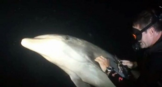 Дельфин менял положение тела, делая работу своих спасателей более удобной. К сожалению, глубоко засевший крючок извлечь из плавника не удалось, но дайверы все же обрезали леску.