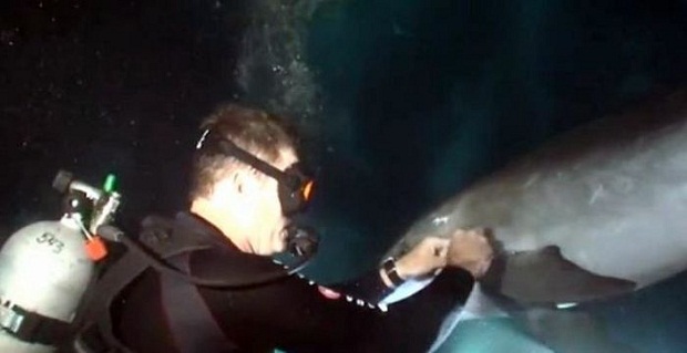 Люди быстро поняли, что животное не просто любопытное, а нуждается в помощи и присмотревшись, один из дайверов увидел, что плавник дельфина опутала леска. Мужчина прямо под водой начал помогать животному освободиться от снасти.