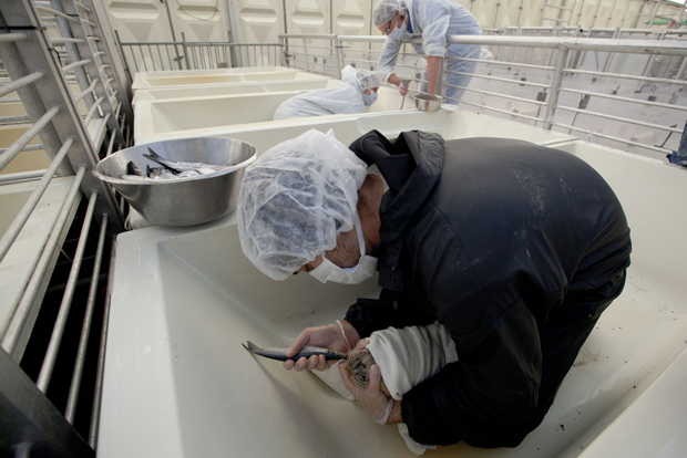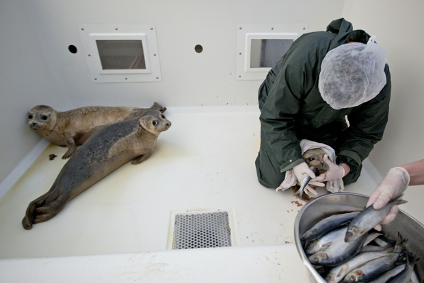 6. Доброволец (справа) кладет лекарство в селедку, которой будут кормить тюленей.