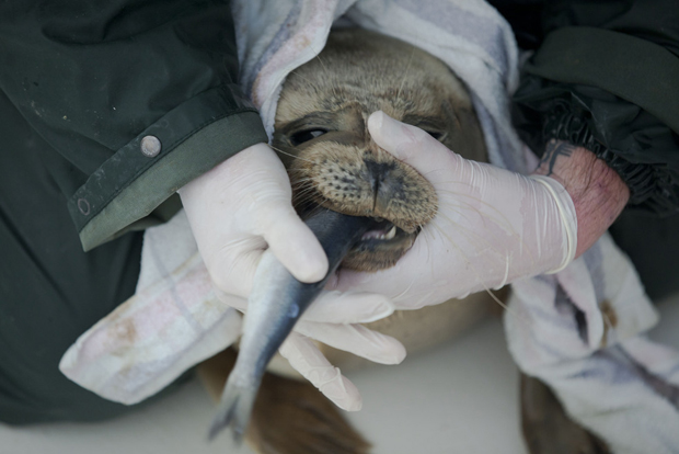 3. Добровольцы кормят маленьких тюленей смесью из растертой селедки. Детеныши отбились от своих сородичей и были брошены на произвол судьбы. Местные ветеринары подобрали тюленят и взяли под свою опеку.