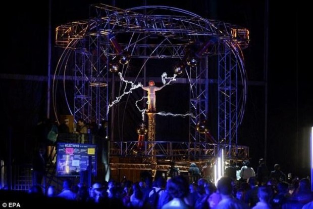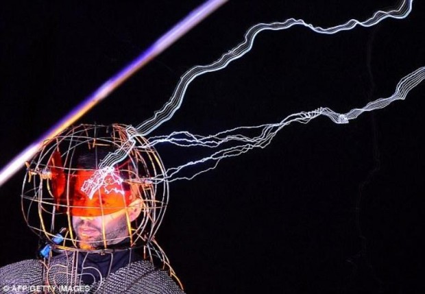 Американский иллюзионист Дэвид Блэйн отважился простоять трое суток подряд под напряжением в миллион вольт. 7 гигантских трансформаторов инженера Теслы направлены на смельчака искусственные молнии.
