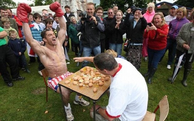 Это поистине странное соревнование состоялось 24 июня в английском городке Сватон, где участники состязались в двоеборье – Русская яичная рулетка и Яичная катапульта. Чтобы принять участие в чемпионате, из Германии и Южной Африки приехали целые команды спортсменов. Состязание Русская рулетка представляет собой противостояние двух противников, задача которых сводится к тому, чтобы найти и разбить об лоб самое мягкое яйцо. Для этого берётся 6 яиц: 5 из них варится вкрутую, а одно остаётся сырым. Кто выберет и разобьет себе об голову варёное – тот и выиграл! Вход для посетителей был бесплатным, однако те, кто в качестве бонуса хотели побросаться уцелевшими остатками скорлупы в оголённго по пояс бодибилдера Джоэла Хикса, должны были заплатить около 3$ за 3 попытки.