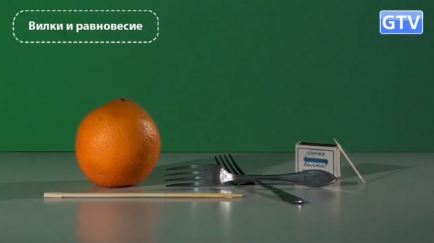 Для опыта понадобится: две вилки и спичка. 1. Соединяем две вилки вместе. 2. Вставляем кончик спички в место соединения вилок, а другой конец ставим на край деревянной палочки. 3. Поджигаем кончик спички, который свисает с края палочки. Итог: две вилки держатся на кончике спички, которая, в свою очередь, другим концом стоит на краю деревянной палочки.