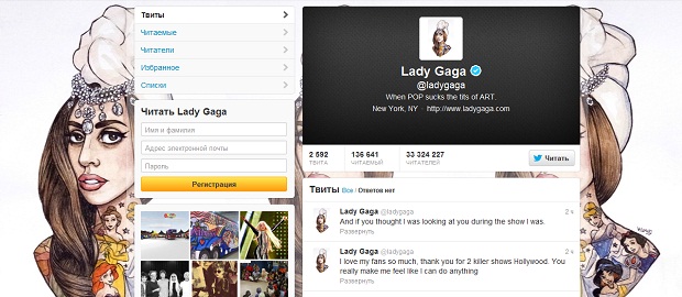 Леди Гага стала первой в интернете, кто преодолел рубеж сначала в 10, затем в 20, а после и в 30 миллионов подписчиков в микроблоге. Несмотря на временную сдачу позиций, певица по-прежнему возглавляет топ самых популярных пользователей Facebook. В социальной сети ее страницу мониторят почти 59 миллионов человек против 50 миллонов «лайков» профилю Бибера.