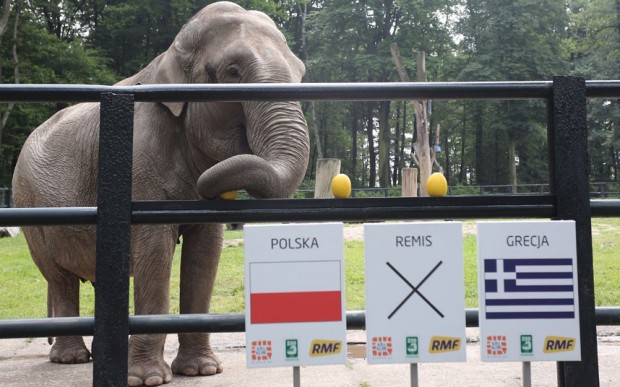 4. Пища к размышлению: слон Чита в Кракове, Польша, считает, что Польша выиграет у сборной Греции.
