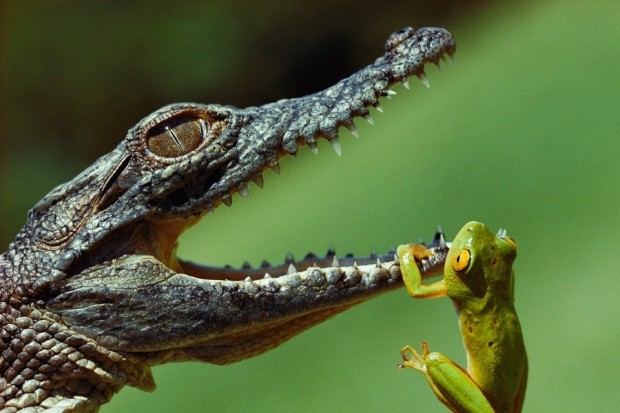 Годовалый нильский крокодил пытается ухватить лягушку в St. Lucia Estuary. Часть заболоченного местности iSimangaliso Wetland Park, признанной ЮНЕСКО в 1999 году объектом Всемирного наследия, заповедная зона крупнейшей в Африке устьевой системы.