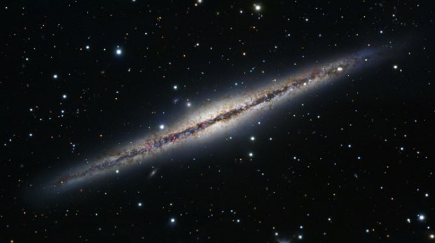 Это галактика NGC 891, размер которой около 100 тысяч световых лет, с нашей точки зрения она видна почти точно с ребра. NGC 891 находится в созвездии Андромеды, от нас находится на расстоянии 30 миллионов световых лет и очень похожа на наш Млечный Путь. Сразу привлекает внимание ее плоский, тонкий диск и центральный балдж, который пересекает темная полоса поглощающей свет пыли. На изображении видны также молодые, голубые звездные скопления и розоватые области звездообразования.