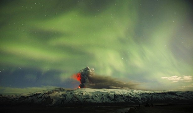 Фото дня 4.06.2012 Северное сияние над пеплом от вулкана Эйяфьядлайёкюдль в Исландии. Знаешь того, кому необходимо увидеть это? Сообщи: