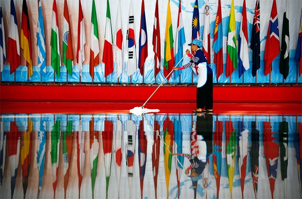 Фото дня 5.11.2012 Уборщица моет пол перед флагами стран, участвующих в форуме «Азия-Европа» во Вьентьяне, Лаос. Знаешь того, кому необходимо увидеть это? Сообщи: