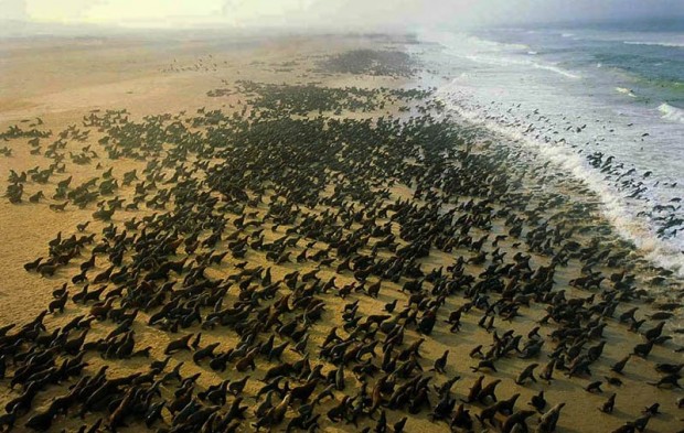 Колония тюленей в сезон размножения в Намибии. Прибрежное море вследствие созданного течением Бенгала апвеллинга чрезвычайно богато рыбой, поэтому и привлекает сюда огромное количество тюленей, чтобы вывести детёнышей. Тюленьи лежбища находится преимущественно в пределах Шпершебита и национального парка «Берег Скелетов» пустыни Намиб.