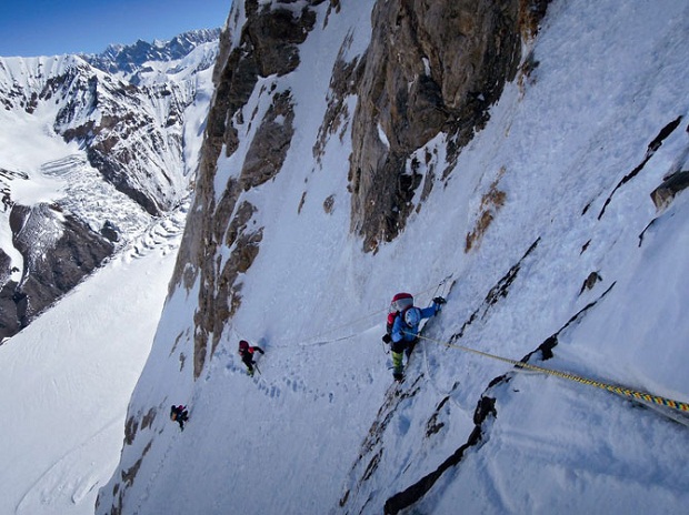 Фото дня 7.09.2012 Крутой маршрут.С помощью ботинок с шипами, ледорубов и заранее укрепленных веревок альпинисты продвигаются на запад по кромке Северного гребня. Знаешь того, кому необходимо увидеть это? Сообщи: