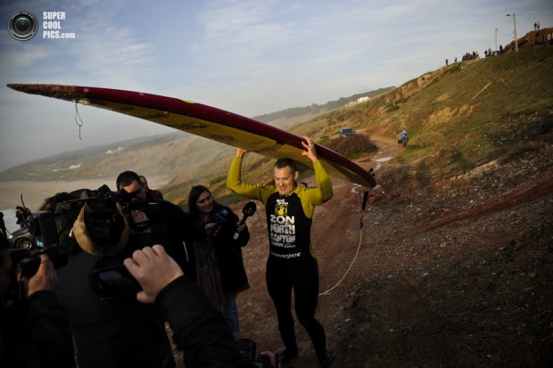 Сёрфер Гарретт Макнамара готовится к рекордной волне, Прайа-ду-Норте, Португалия. (AP Photo/Francisco Seco)