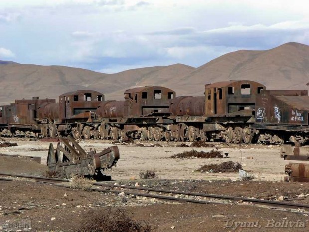 Недалеко от города Уюни, в Боливии, расположено кладбище паровозов. Да, вот так просто, прямо посреди жаркой пустыни, оставлены десятки, а то и сотни, ржавых машин. Когда-то давно это была прибыльная станция, вокруг было много рудников. Но скоро залежи истощились, станция стала банкротом и технику с железнодорожной станцией просто бросили. Так как климат на Боливийском нагорье засушливый железо ржавеет очень медленно и по-своему красиво. Вот серия фотографий из этого места, туристов здесь почти нет…