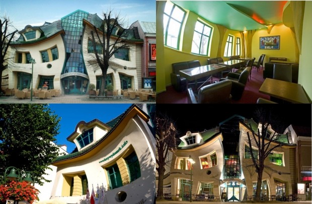 Глядя на это искривлённое сооружение, невольно приходит мысль, что это обычный и банальный Фотошоп. Увы, вынужден вас обрадовать: здесь нет совершенно никакой фотографической ретуши. Это реальное изображение существующего в польском городке Сопот торгового центра под названием Krzywy Domek (Кривой домик). Проект был разработан дизайнерами из архитектурного бюро Szotyńscy & Zaleski, которых во время работы вдохновляли сказочные иллюстрации Яна Марчина Шанцера и Пера Далберга. Как и на рисованных изображениях, этот дом имеет такую же необычную и мультяшную геометрию.