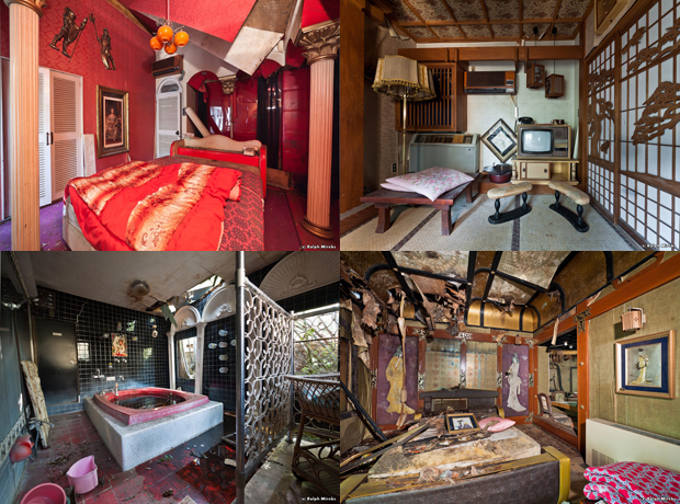 И вновь я возвращаюсь к теме заброшенных японских отелей, на этот раз небольшого мотеля. Двухэтажное здание на десять номеров, на первом этаже большой гараж из каждого бокса которого идет узкая лесенка непосредственно в номер. Таким образом, центрального зала здесь нет, а в номере можно остановиться и жить совершенно не встречаясь с другими постояльцами. Отель был открыт в 1973 году, закрыт в 1997-ом, и самое интересное в нём – оформление номеров. Обычно, такой необычный декор характерен для специальных отелей для занятия сексом, которых по всей Японии великое множество. Комнаты в таких лав-отелях сдаются по часам и только парам, но в описываемом месте их можно было снять как на сутки, так быть при этом в одиночку. Цены умеренные – до 9000 йен в день и 2000 йен за пару часов секс-отдыха.