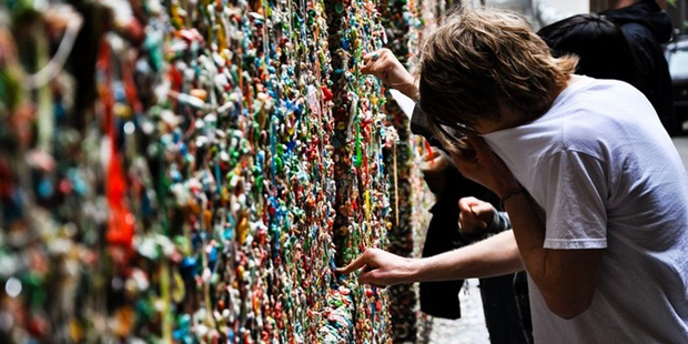 Яркая и забавная улица Калифорнии, стены которой улеплены сверху донизу самыми разными пожёванными жвачками. Наверно, там не очень вкусно пахнет, люди на фото закрывают носы! :)