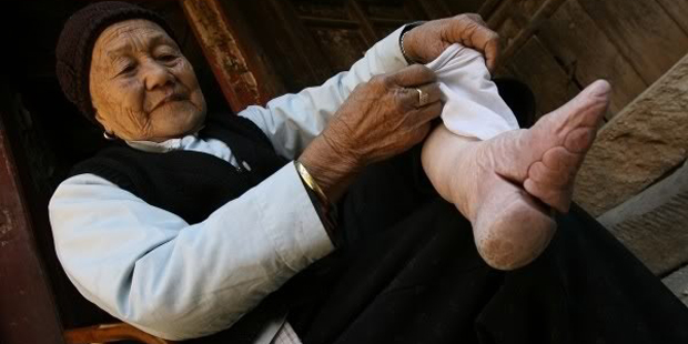 Обычай бинтовать ноги китайским девочкам, похожий на методы компрачикосов, представляется многим так: детскую ножку забинтовывают и она просто не вырастает, оставаясь такого же размера и такой же формы. Это не так- существовали особые методы и ступня деформировалась особыми специфическими способами. Идеальная красавица в старом Китае должна была иметь ножки- как лотосы, семенящую походку и покачивающуюся, словно ива, фигурку. В старом Китае девочкам начинали бинтовать ноги с 4-5-летнего возраста (грудные младенцы еще не могли терпеть муки от тугих бинтов, калечивших их стопы). В результате этих мучений где-то к 10-ти годам у девочек формировалась примерно 10-сантиметровая лотосовая ножка. После этого они начинали учиться правильной взрослой походке. А еще через 2-3 года они уже были готовыми девицами на выданье. Размеры лотосовой ножки стали важным условием при заключении браков. Невесты с большими ногами подвергались насмешкам и унижениям, так как были похожи на женщин из простонародья, которые трудились в полях и не могли позволить себе роскошь бинтования ног.