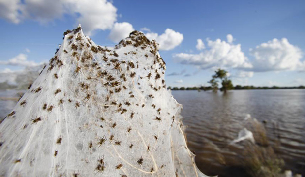 В Австралии продолжается масштабное наводнение – люди вынуждены бросать свои дома, а местные членистоногие осваивают новые места обитания. Спасаясь от прибывающей воды, они оплели липкой паутиной все незанятые паводком островки суши.