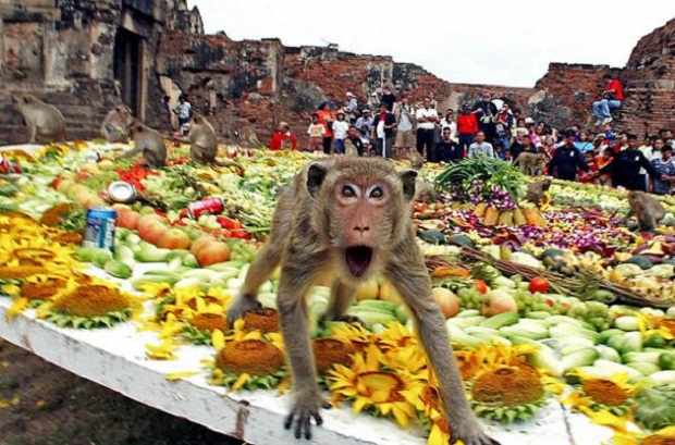 Таиланд издавна считается родиной необычных праздников и традиций. Одно из таких торжеств — это обезьяний банкет. Один раз в год 600 обезьян приглашают к обеду — на 7 метровом столе им выкладывают 2 тонны еды. Таким образом жители города Лопбури благодарят макак за победы в былых войнах.