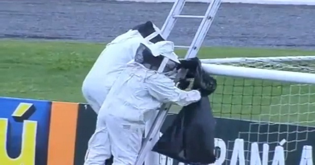 Рой пчел сорвал футбольный матч в Бразилии. Пчелы облюбовали себе перекладину на воротах на стадионе Мойзес Лукарелли.