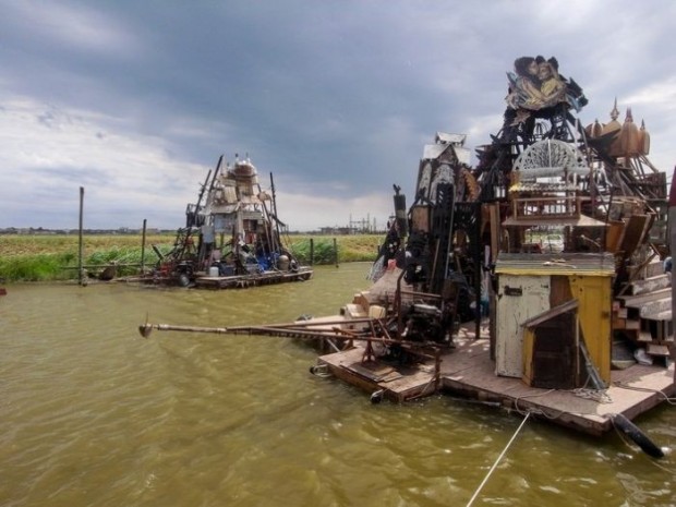 То, что вы видите на этой фотографии — не просто куча барахла и мусора. Плоты просвещения — именно так называются эти сооружения из переработанного мусора, на которых целые группы художников и артистов из США путешествуют по Европе, показывая драматические, музыкальные и кукольные представления.