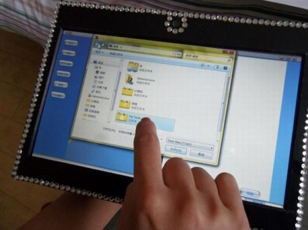 Работает псевдо iPad на базе Windows 7. По словам студента, он не стал устанавливать официальную версию, и сэкономил на этом еще 100 долларов. При этом, на планшете можно читать, смотреть видео и играть, просто касаясь экрана.