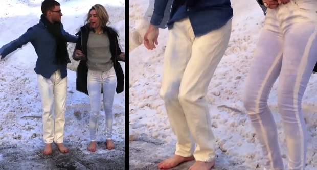 Канадский бренд Naked & Famous выпустил джинсы, меняющие цвет под воздействием температуры тела. Если вы замерзли, джинсы становятся синими, как только вы согреваетесь, они превращаются в белые. Эффект достигается благодаря термохромному красителю ткани, в состав которого входят молекулы, меняющие оттенок при смене температуры.