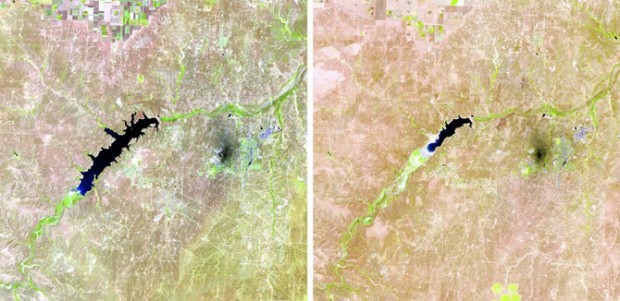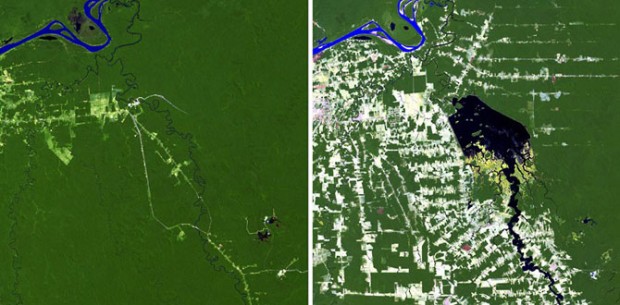 В 1984 в Бразилии только начинались работы над строительством дамбы Samuel, расположенной на реке Джамари в Рондонии. Второй снимок, сделанный в 2011, показывает, как повлияло наличие дамбы и водохранилища на окружающие леса.
