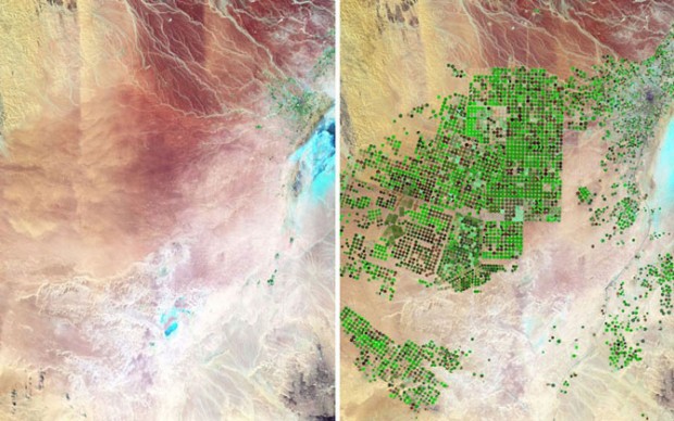На фотографии, сделанной со спутника в 1987 году, на этой части Саудовской Аравии можно увидеть лишь огромную пустыню. Но к 2012 году большая часть этого региона превратилась в сельскохозяйственные угодья, похожие на зеленые точки на бесплодных землях.