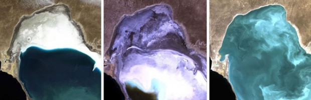 На фотографиях, сделанных в 1973, 1987, 1999, 2004, 2007 и 2009 годах, показано, как исчезает Аральское море между Казахстаном и Узбекистаном. Когда-то одно из самых больших озер на земле было уничтожено советскими проектами по орошению.