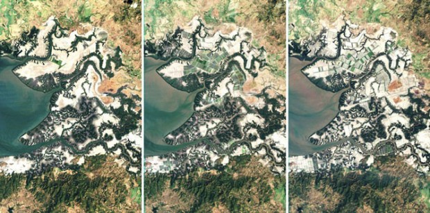 На фотографии 1992 года территория Бинхай в Китае представляет собой малонаселенную, болотистую местность. Но уже к 2012 году этот район превратился в развитую экономическую зону.