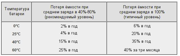 Высокие температуры отрицательно влияют на срок жизни вашего аккумулятора. В представленной ниже табличке вы можете увидеть зависимость потери заряда батареи от температуры, в которой она находилась. Так что берегите свои устройства от перегрева и не работайте с ноутбуком на коленях.